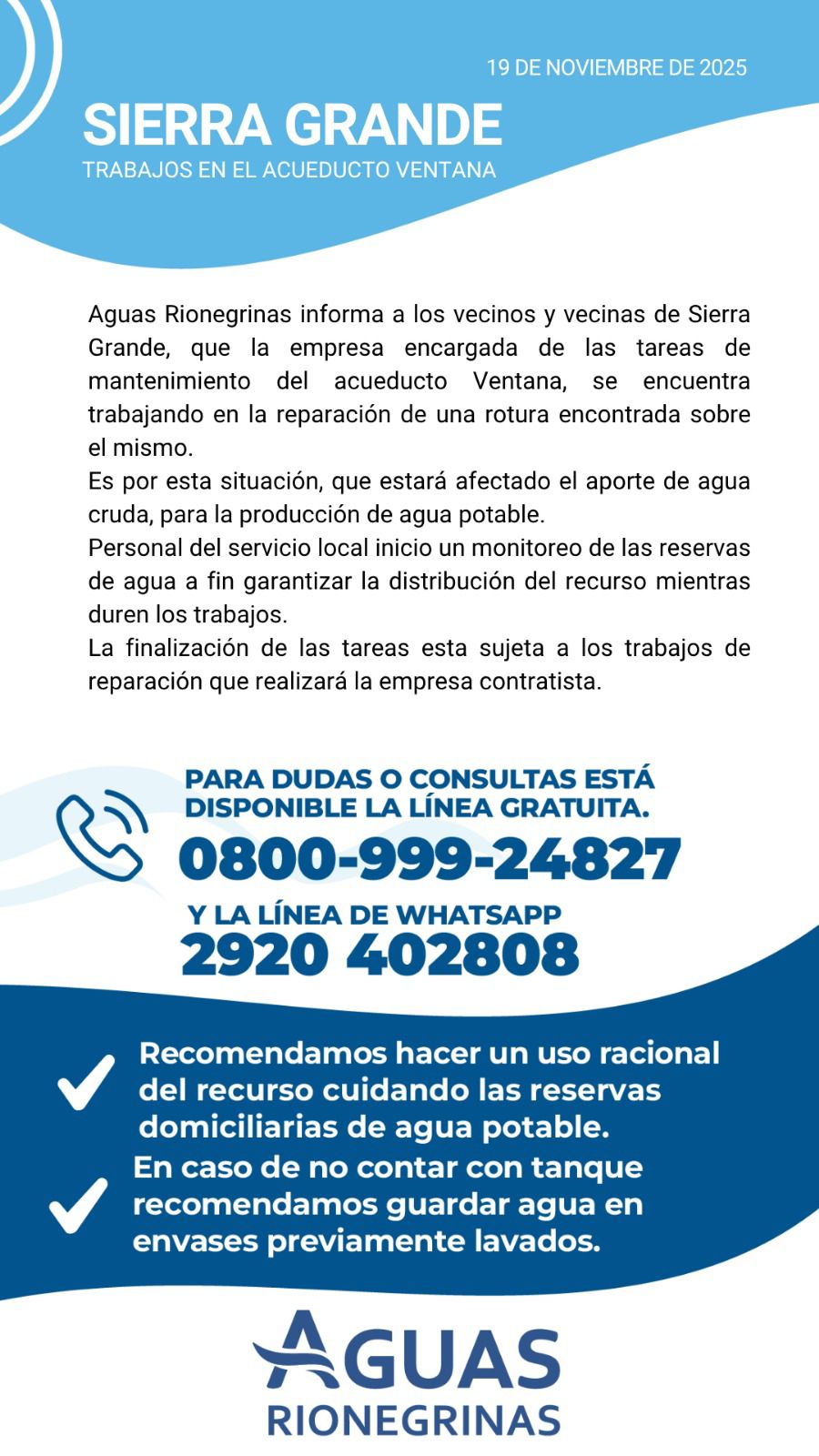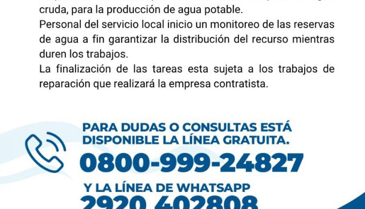 Aguas Rionegrinas comunica que, por la reparación de una rotura en el acueducto Ventana, podrá verse afectado el suministro de agua. El personal local monitorea las reservas para asegurar la distribución mientras duren los trabajos.