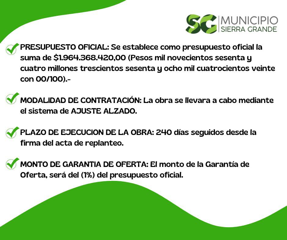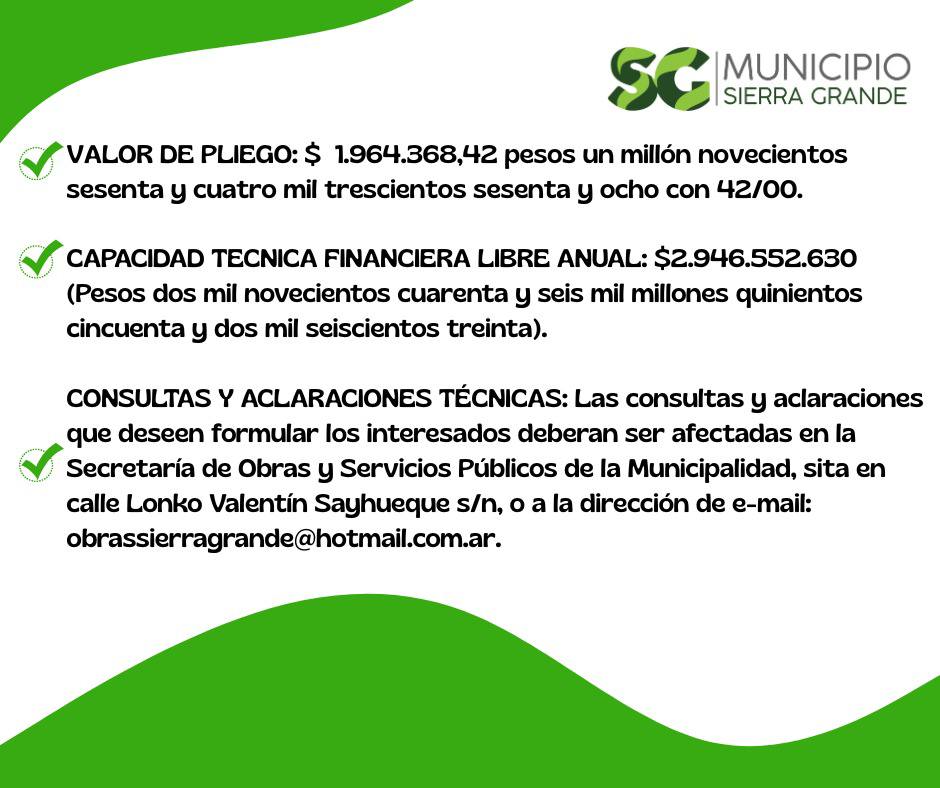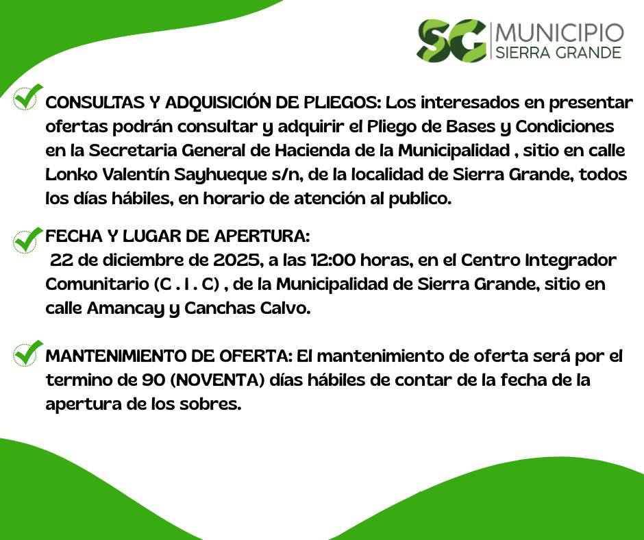 LicitacionesNoticias Llamado a Licitación Pública N.º 009/25 para una nueva obra de pavimentación con hormigón, Sierra Grande sigue creciendo By Prensa Sierra Grande On Dic 8, 2025 Share Se abrió la Licitación Pública N.º 009/25 para una nueva obra de pavimentación con hormigón, financiada con fondos del bono del VMOS. A continuación, dejamos la información para las empresas interesadas en participar del proceso. . Share FacebookTwitterGoogle+ReddItWhatsAppPinterestEmail